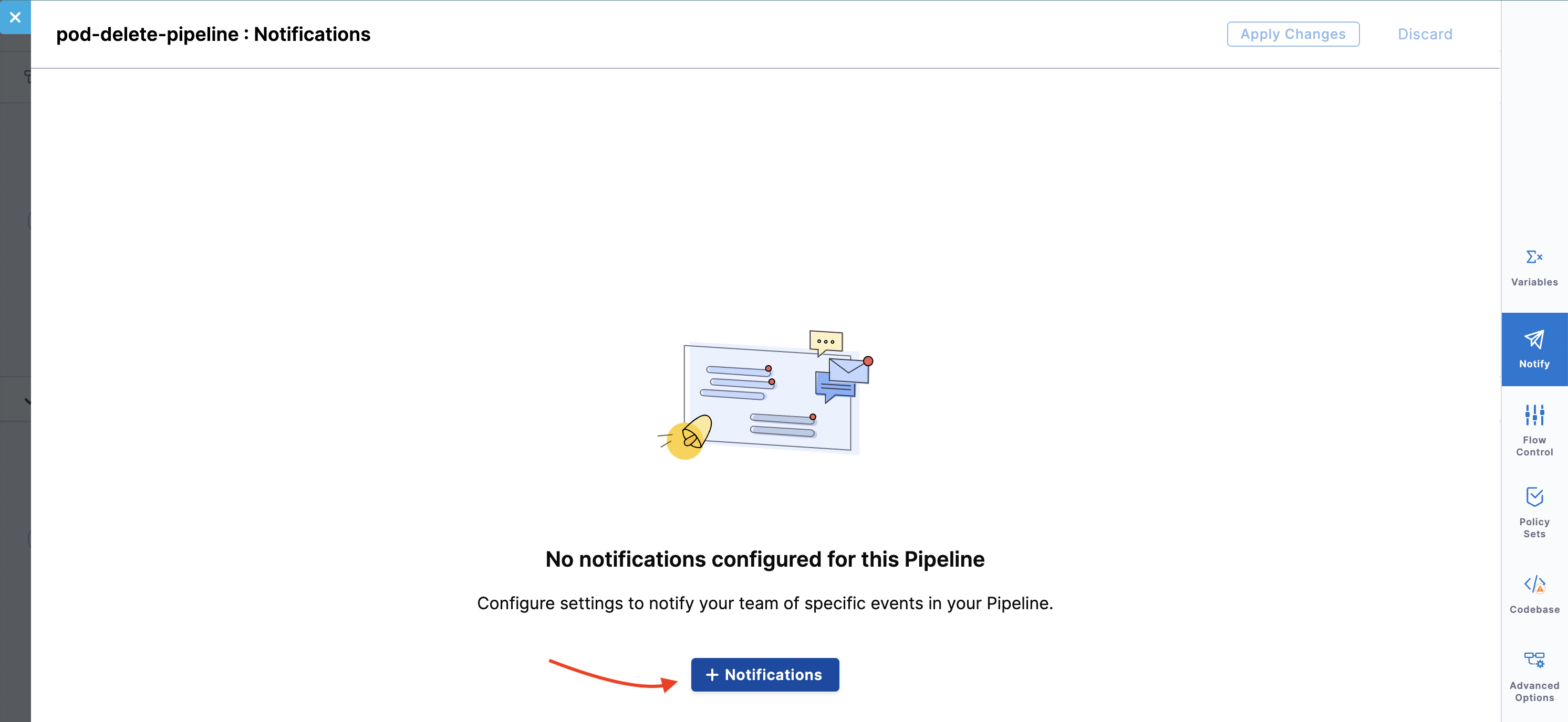 Click Notifications to configure a notification for the pipeline. Provide a name for the notification and click Continue.
