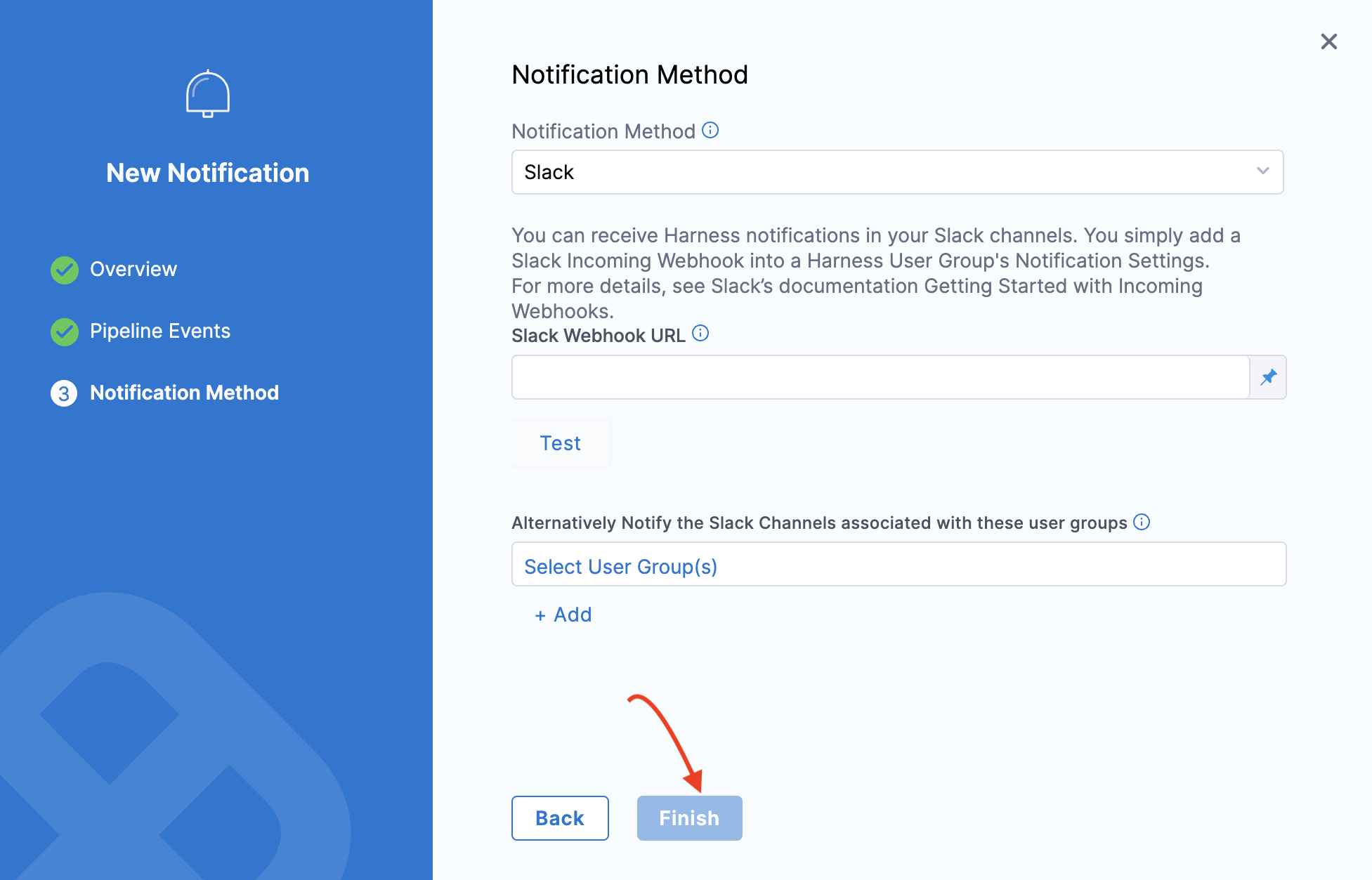You can choose one of the notification methods. For example, Slack. Provide the relevant parameters, which in this case, is the Slack Webhook URL. Click Finish.