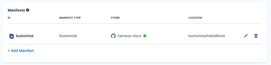 In Manifests, click Add Manifest. noteWhat about Artifacts? In this quickstart the kustomization uses a publicly-available NGINX Docker image from DockerHub, and the location of the image is hardcoded in the manifest. The Artifacts section is only used when the public artifact is not hardcoded in the manifest or the repo is private. In those cases, you add the image in Artifacts with a Connector for the repo and then reference the image in a Kustomize Patch file ( image: <+artifact.image>).