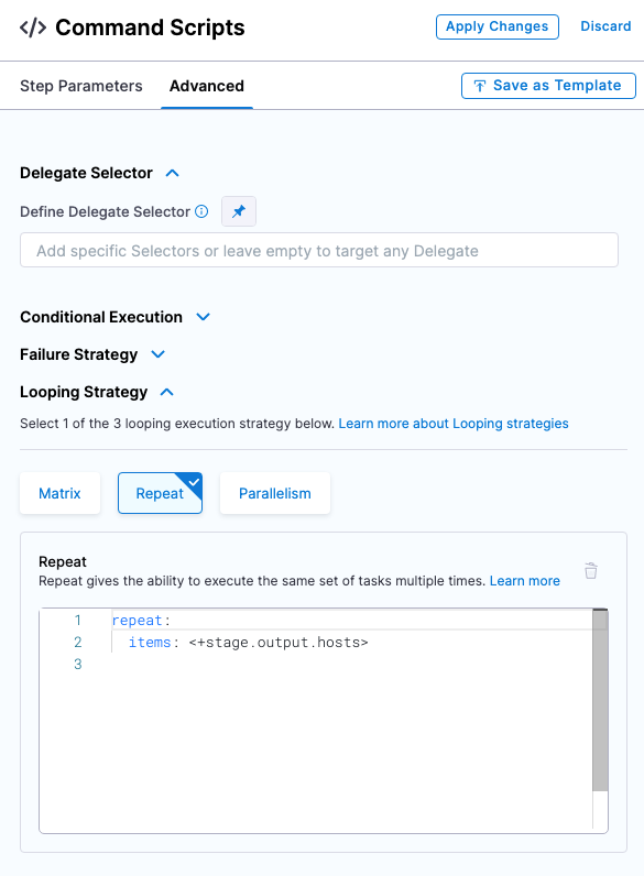 Only the Repeat Looping strategy is supported by the Command step. Also, only the items parameter is supported when running the Command step on multiple target hosts: