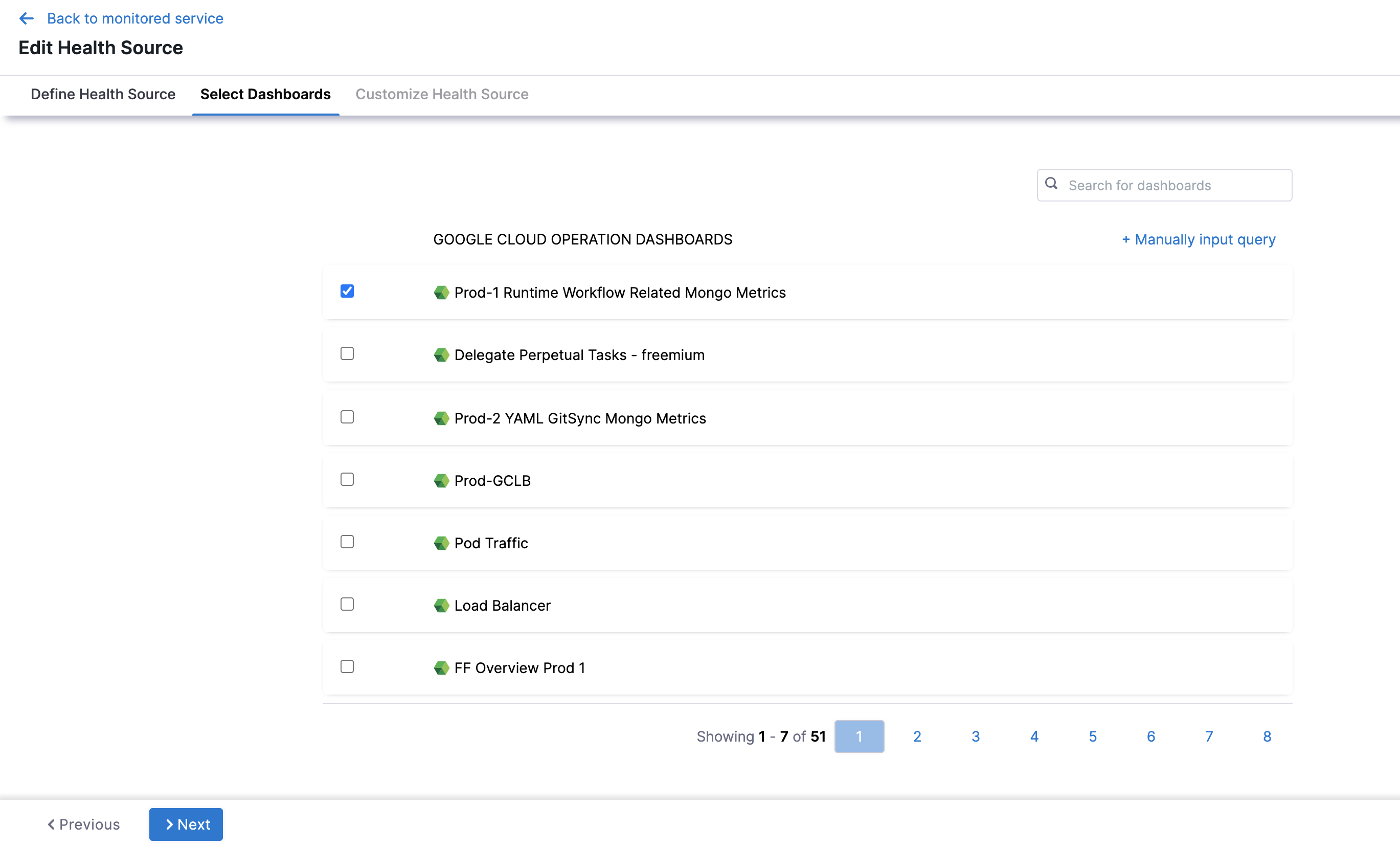 2. Click one or more dashboards from the displayed results. If you don't have any pre-existing dashboards or don't want to select the ones in the displayed result, click Manually input query.