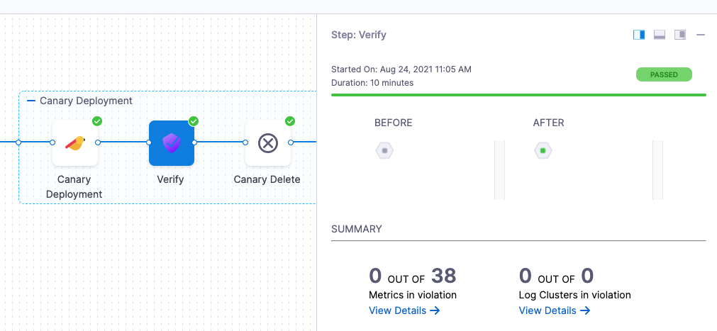 - Harness will automatically add the Verify step. For example, here is a stage where Canary strategy and the Enable Verification option were selected
