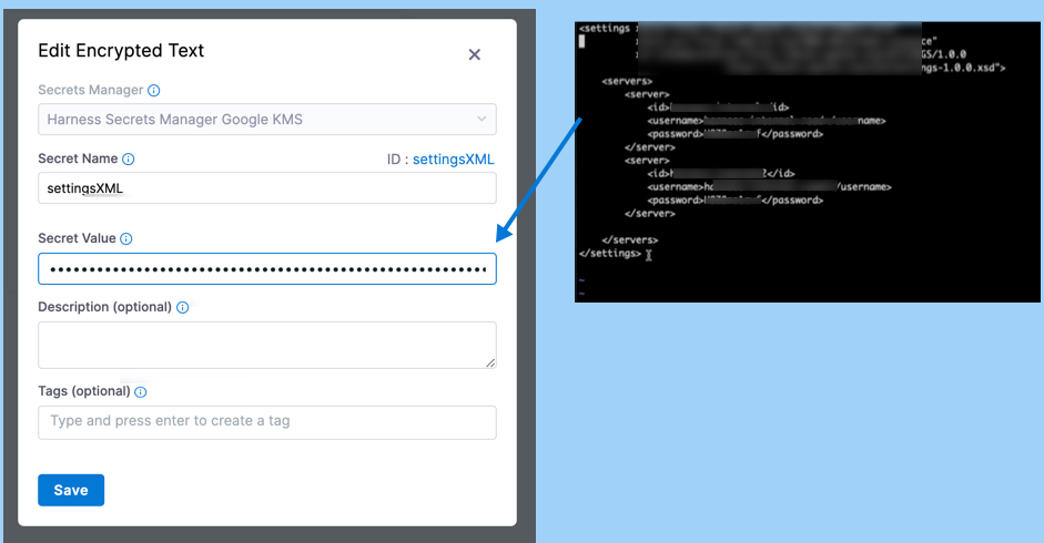 settingsXML. Take note of the ID. You need it to reference the secret in your pipeline. - In Secret Value, paste the XML settings content from your