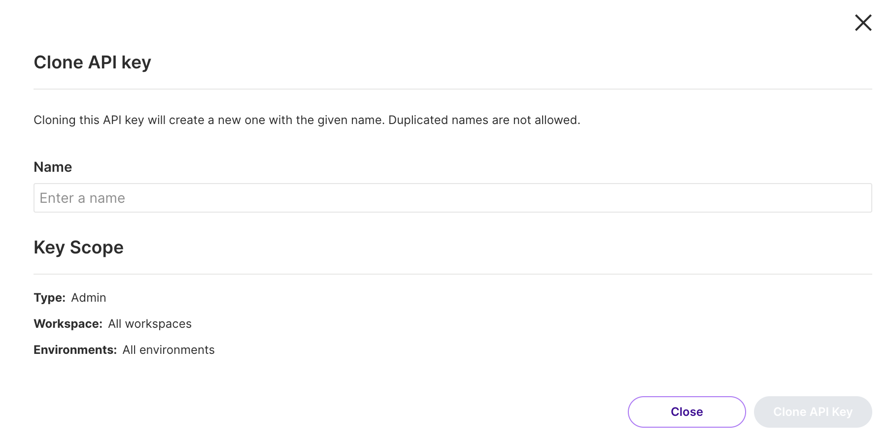 From the Admin API keys tab, click Clone on the desired key. The Clone API key view appears.