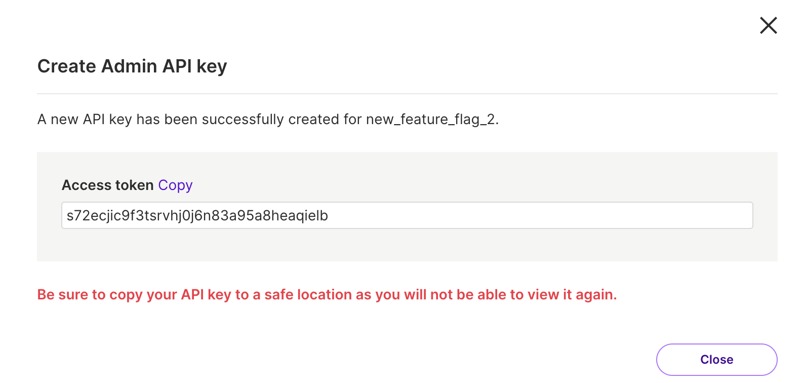 - A specific project: The API key will grant access to manage the resources (flags, segments, traffic types, etc.) within only a single project. Access is also granted to manage future environments created within that project.