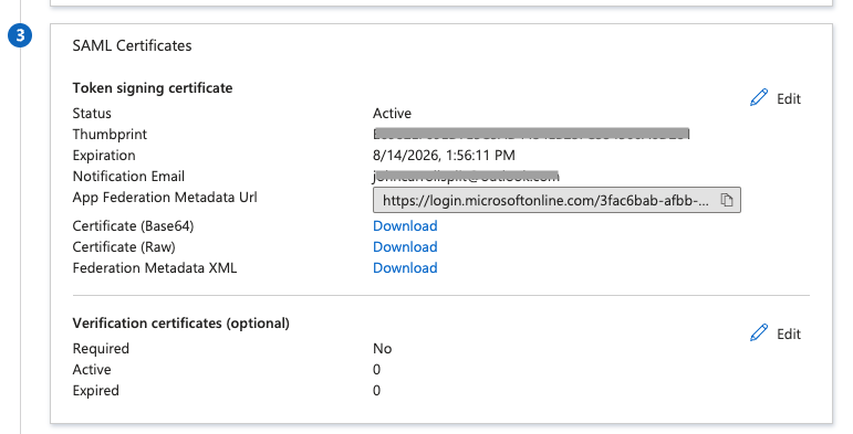 6. In the SAML Certificates section, click to download the SSO Federation Metadata XML. Note where you save the XML file.