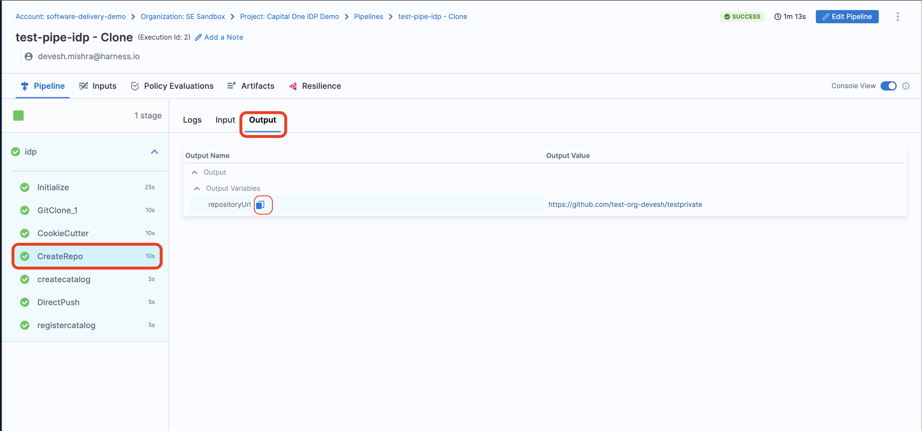 • In this case, pipeline.stages.testci.spec.execution.steps.Run_1.output.outputVariables.test1 is derived from: