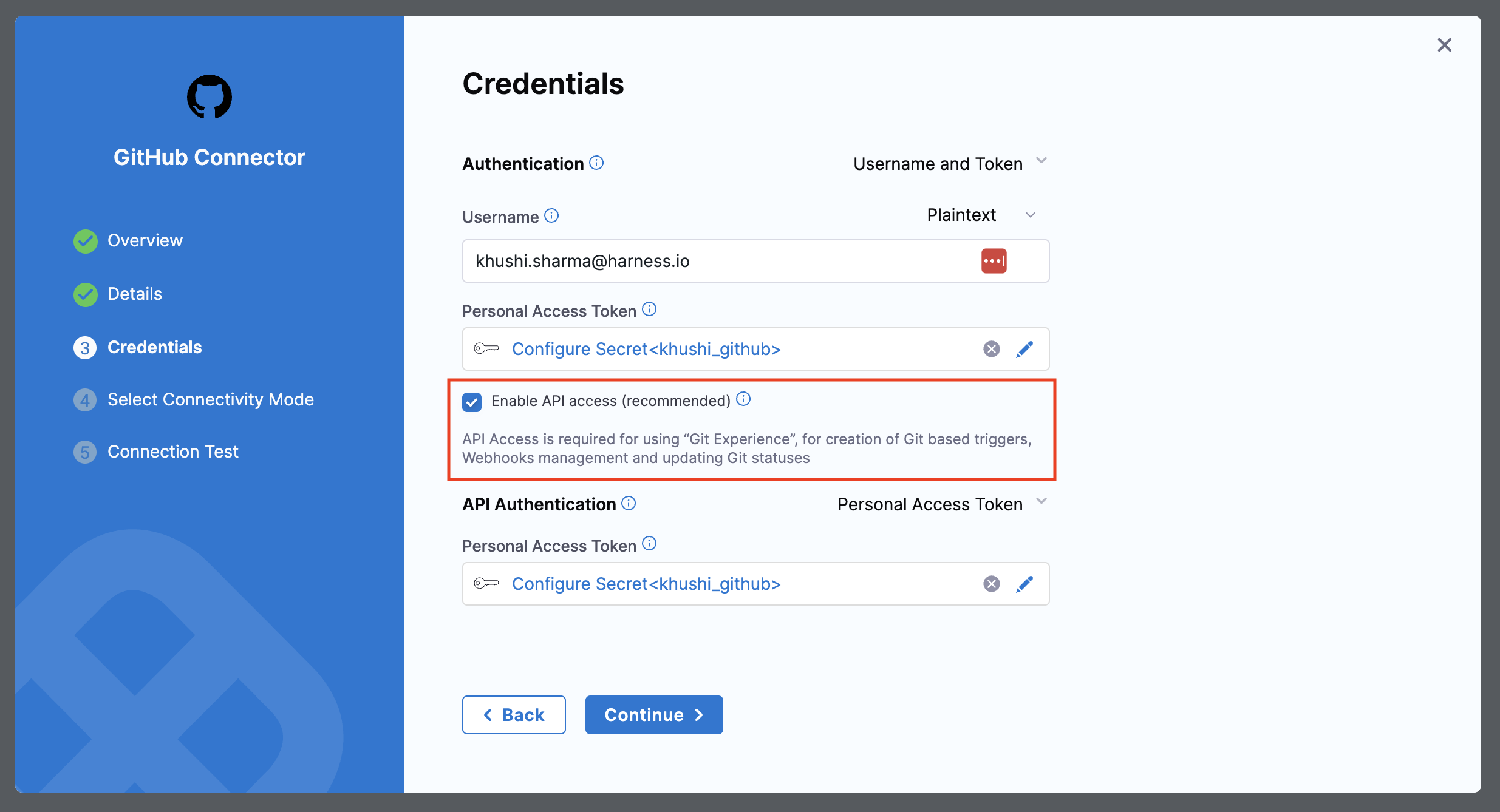 - Enable API Access: For connection types and authentication methods where API access is not already enabled by default, you'll have to enable it from the Git connector settings. API Access is required for using Harness Git Experience. Refer to these docs to enable API access.