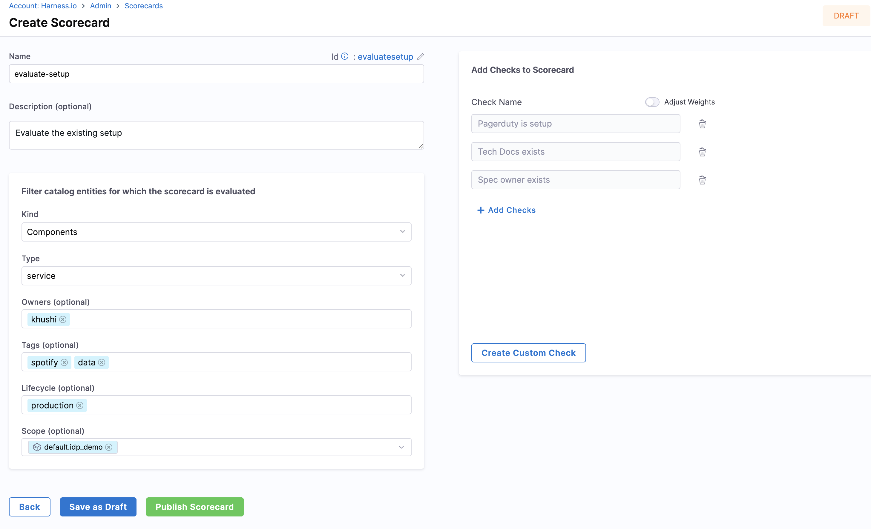 Add Name, Description, Owner (same as that of the software component you want to add this scorecard to) and select the Checks you created above to track the migration and publish the Scorecard.