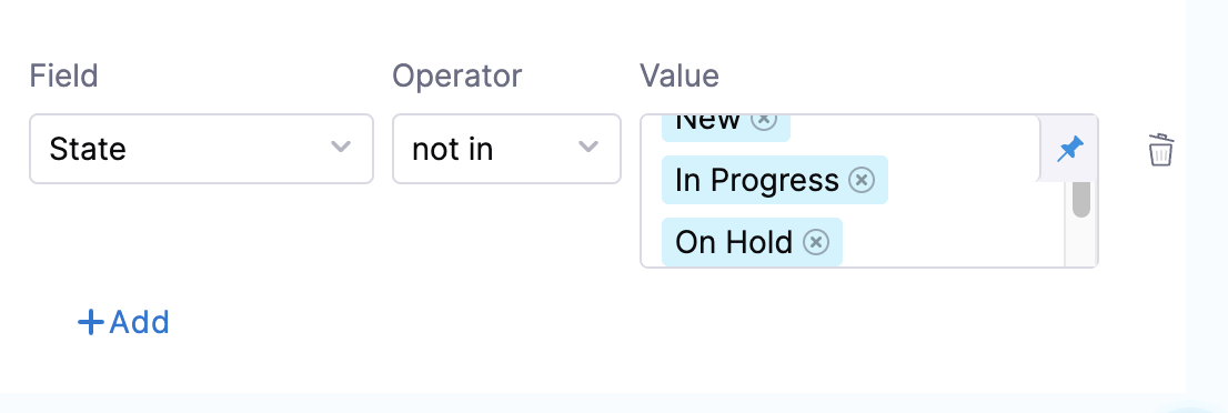 Statefield to not be in eitherNew,In Progress, orOn Holdcan be specified as: