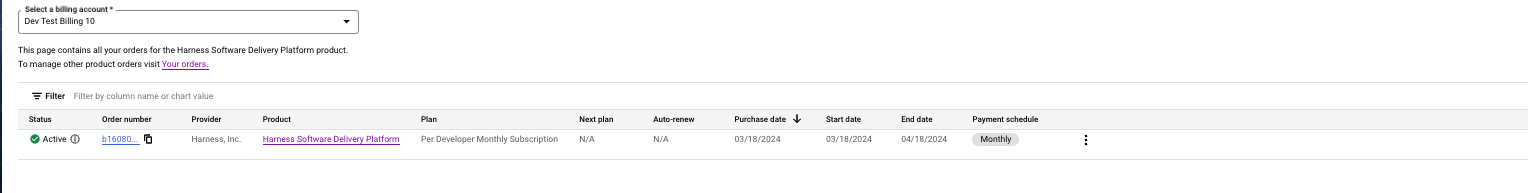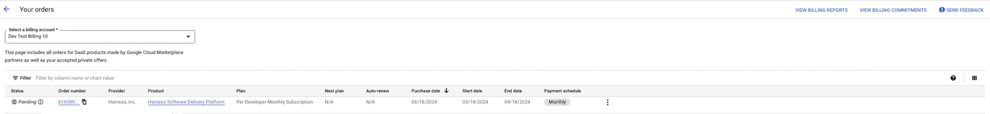 Navigate to Marketplace and go to the Orders section. Initially, your order is in a pending state while the Harness system approves and activates your account. The activation can take several minutes.  Once the account is activated, you can view the updated order status.