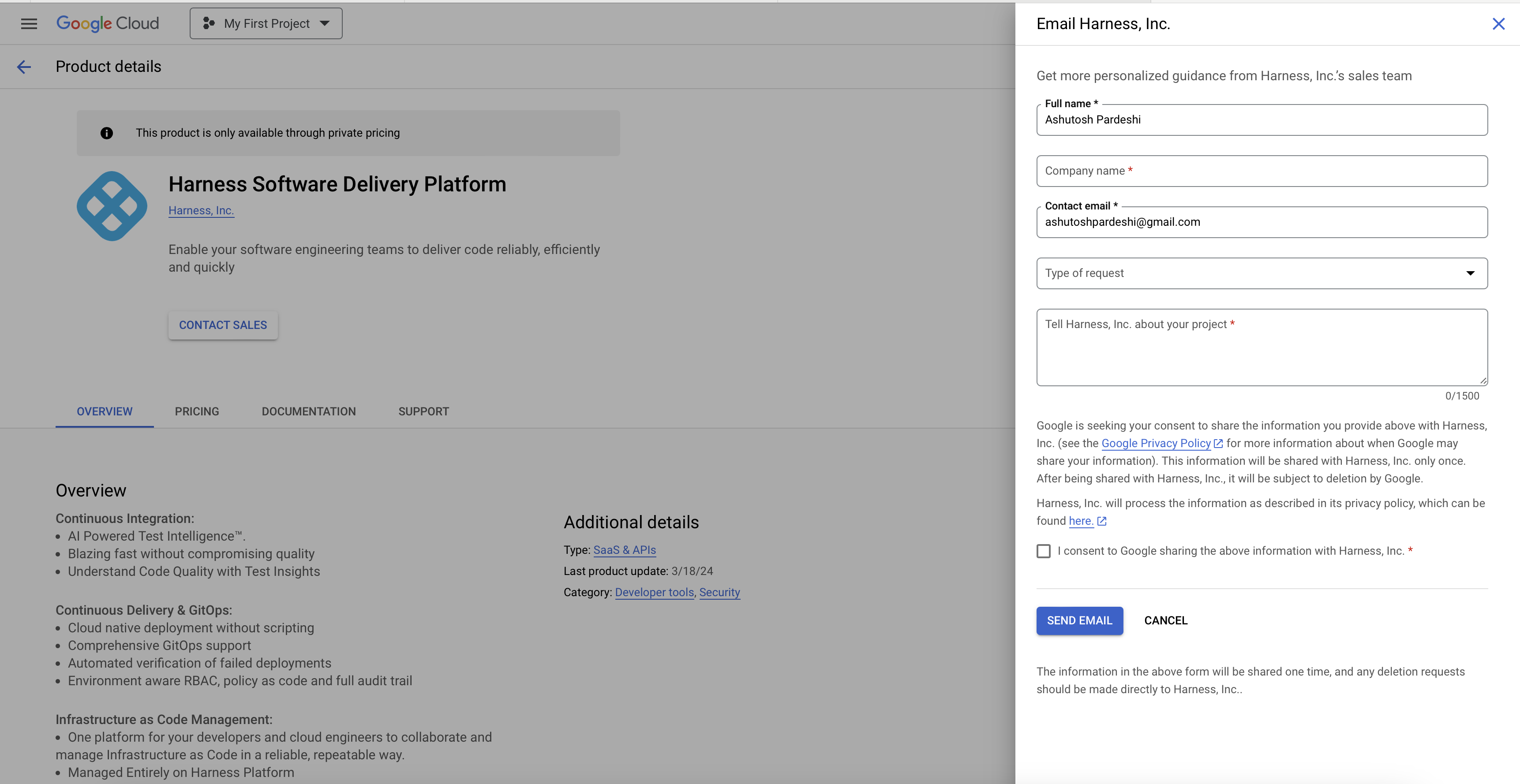If don't have an existing relationship with Harness and you're interested in a Harness product, you can request a custom quote for it. To contact Harness' sales team, select Contact Sales in the Google Cloud Marketplace.