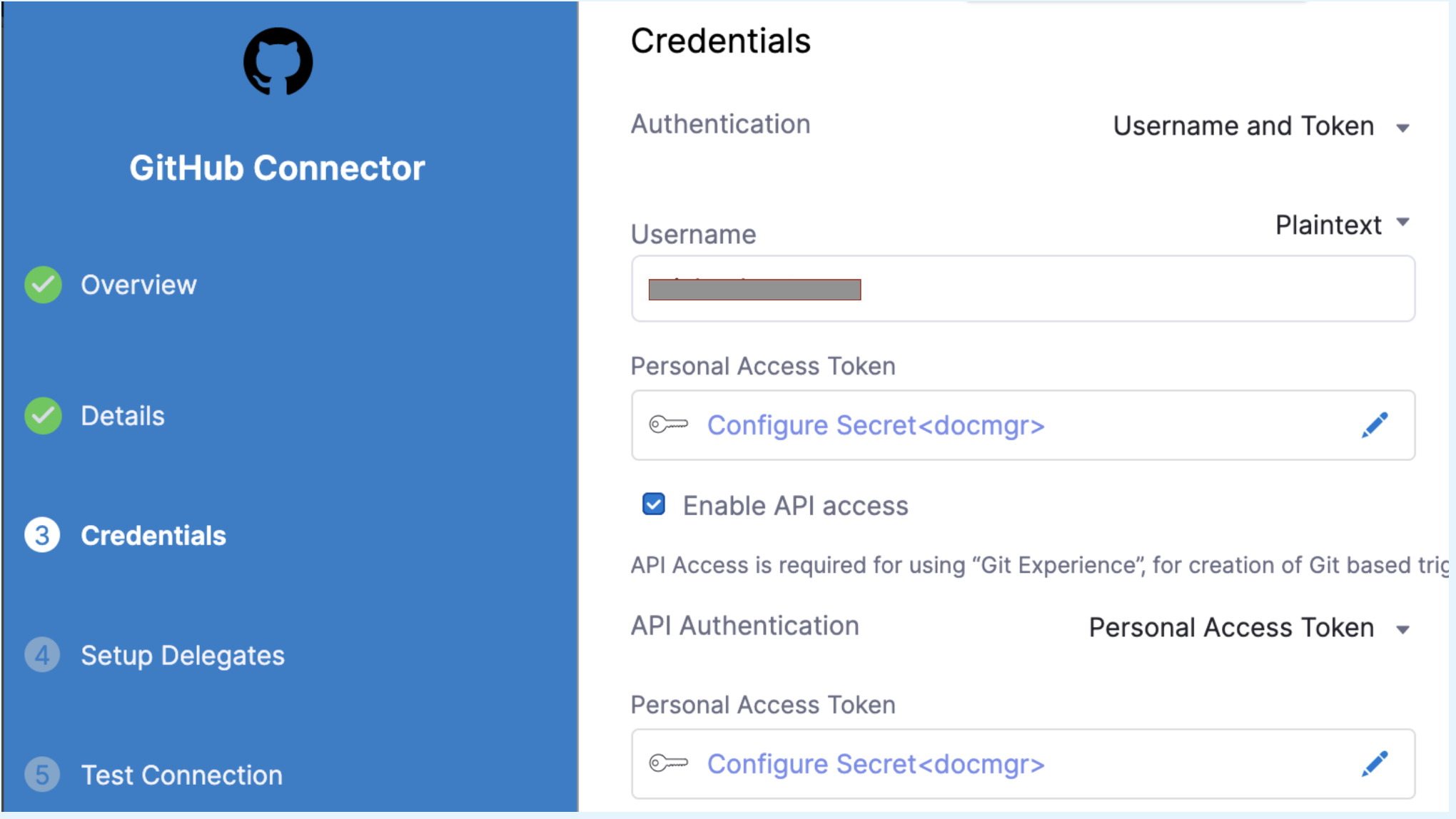 The Git connector must use the Enable API access option and Username and Token authentication.
