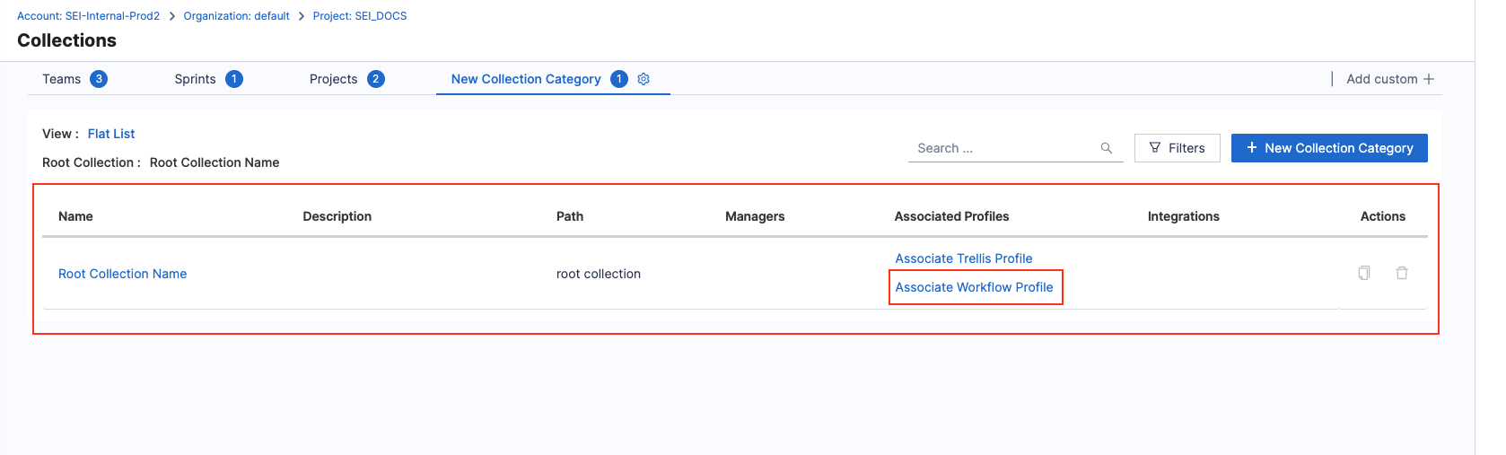 • To associate a DORA profile with the existing Collections, click on the Associate Workflow Profile option under the Associated Profiles column.